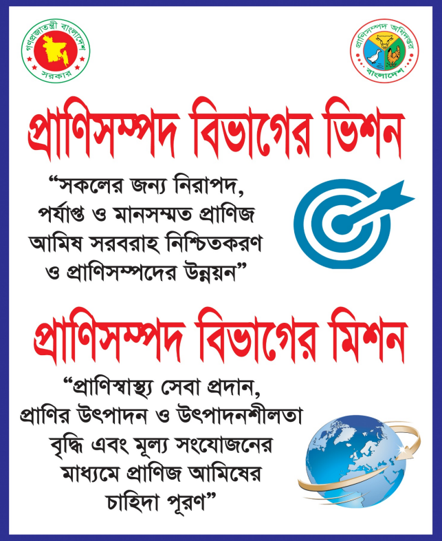 অভিলক্ষ্য (Mission) :প্রাণিসম্পদের উৎপাদন ও উৎপাদনশীলতা বৃদ্ধি এবং মূল্য সংযোজনের (Value addition) মাধ্যমে প্রাণিজ আমিষের চাহিদাপুরণ।